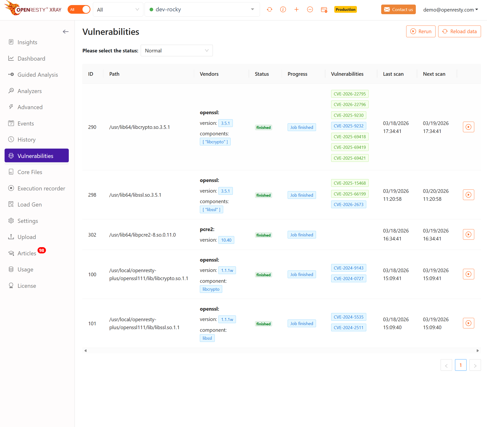 OpenResty XRay automatically discovers all running processes on the system, enumerates their loaded library dependencies, and performs binary evidence verification on each supported component. The entire process requires no manual specification of scan paths and does not rely on the package manager’s database.