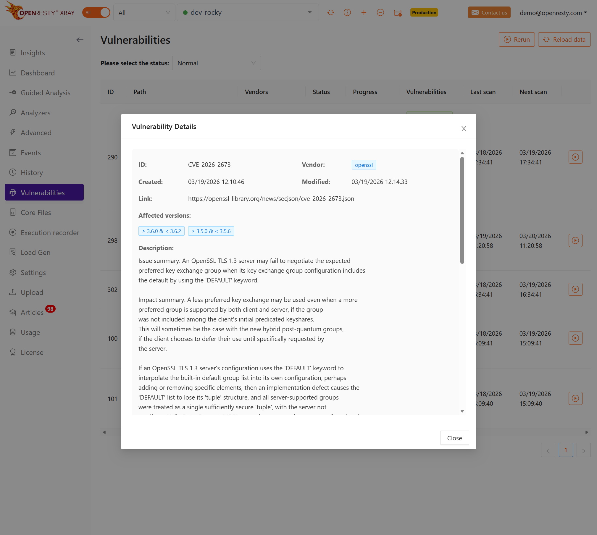 The only CVE marked as Vulnerable, CVE-2026-2673, is likewise absent from the changelog’s fix records. This is because the vulnerability has a low severity level, and the distribution’s maintainers evaluated and decided against backporting a patch for it. OpenResty XRay accurately reflects this reality. It neither misreports the CVE as “fixed” based on the latest version number, nor does it hide the vulnerability just because the distributor has not yet addressed it.