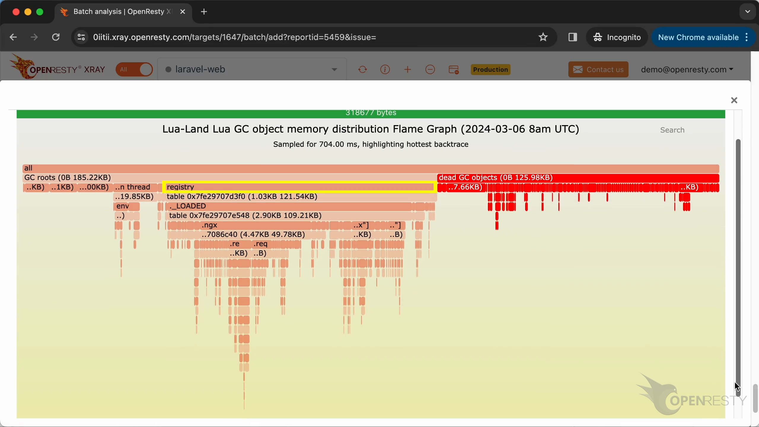 在記憶體相關小節中,Lua 層 GC 物件引用路徑中,很大一部分的記憶體被 LuaJIT 垃圾收集器尚未釋放的死亡 Lua 物件佔用。