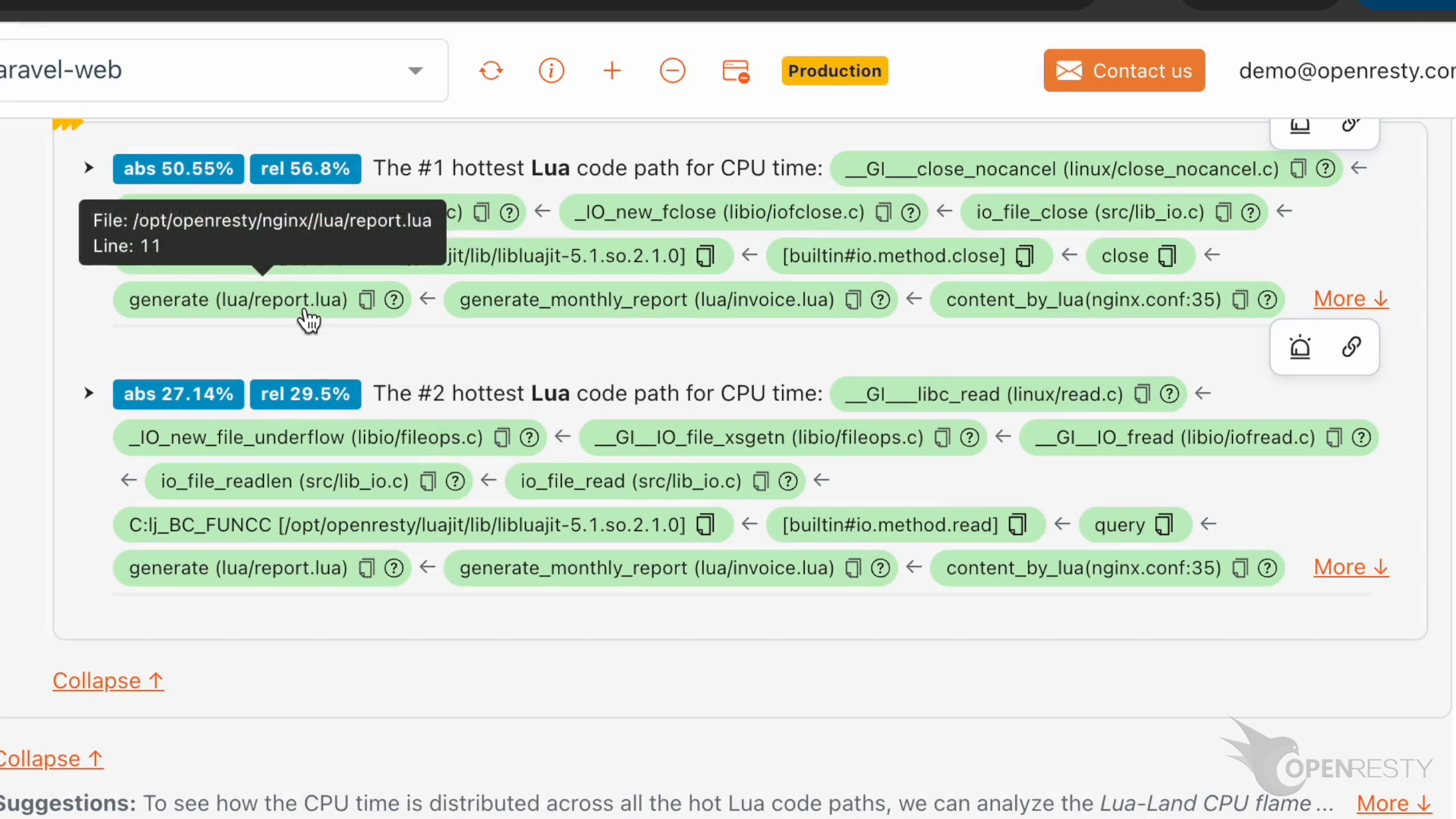 Lua 側會給出佔用 CPU 最多的呼叫路徑:本例中 close 函式被 generate 函式呼叫。generate 是一個 Lua 函式,被定義在 Lua 原始檔 lua/report.lua 中。lua/invoice.lua 檔案中定義的 generate_monthly_report 呼叫了前面那個 generate 函式。